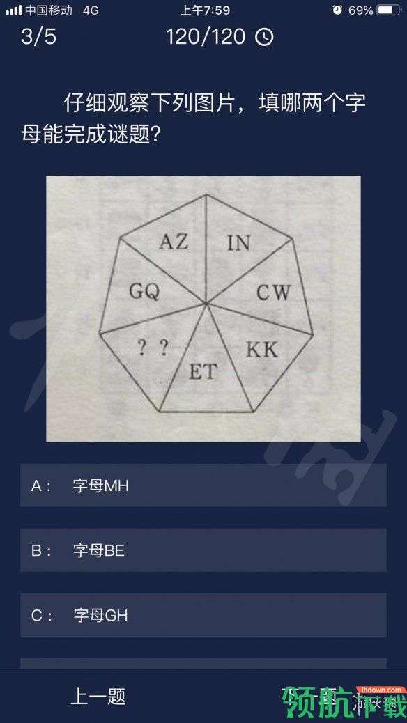 由AZ开始,沿顺时针方向,跳至相隔的栏内。第一个字母由A开始,每次跳至与之间隔为1的字母;第二个字母由Z开始,每次跳至按字母表倒序排列的与之相隔为2的字母