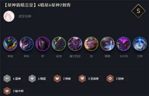 中期拿到烬和小丑后阵容即可快速成型,先使用四暗星+两圣盾+两刺客+两狙神保证中期血量健康,快速提升经济来上人口,后续加上赵信和璐璐组成四星神即可。