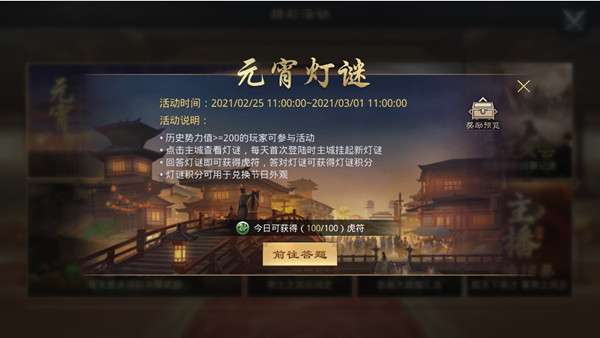 2月25日11点-3月1日11点期间,每位玩家的主城上都会挂起元宵灯笼,每盏灯笼上都有精心设计的灯谜,玩家只要登录游戏,且满足历史势力值大于200的条件,即可通过点击包括自己在内的玩家主城灯笼答题参与活动。