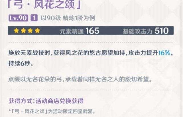 【风花之颂】1级时拥有42点白值,副属性则为元素精通,特效为“释放元素战技时,攻击力提升16%,持续6s”,满精时则可以提升32%。