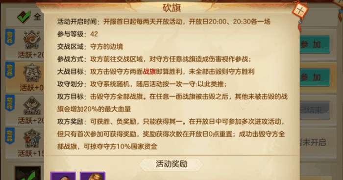 当角色达到42级后每日可以参加砍旗活动,活动每天开放2次,每次持续20分钟,任务奖励功勋、装备晶石。