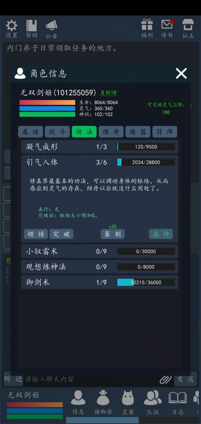 进入游戏后打开礼包,领了功法后要 领悟 突破 才能修炼。