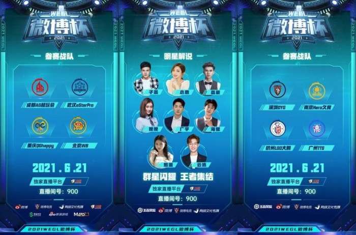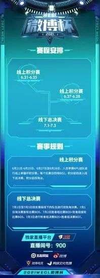 2021首届王者荣耀WEGL微博杯将在6月21日-6月28日(6月26日为KPL春季赛决赛让路,停战一天)展开线上积分赛的较量,8支参赛战队将首先进行线上单循环积分赛。每支战队将完成7场BO2的较量,最终积分赛总分排名前四的战队进军线下总决赛,后四名将直接离开本次比赛的舞台。
