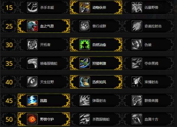 2、AOE天赋推荐如上图所示第一层点动物伙伴,第二层天赋点血之气息,第三层点自然治愈,第四层点狩猎刺激,第五层点迅疾如风,第六层点践踏,第七层点野兽守护。