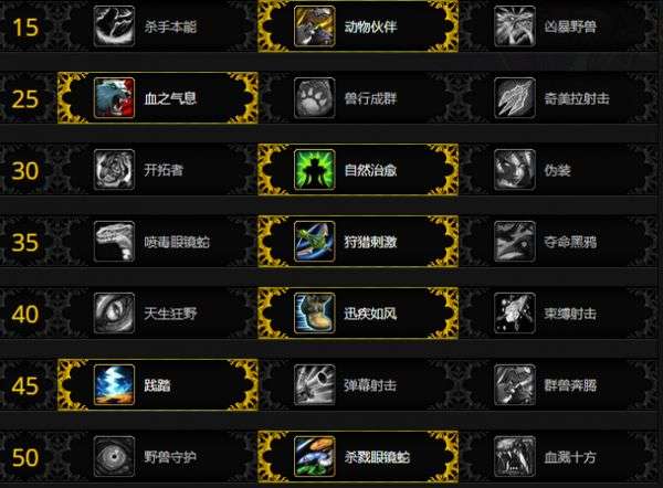 1、单体天赋推荐如上图所示第一层点动物伙伴,第二层天赋点血之气息,第三层点自然治愈,第四层点狩猎刺激,第五层点迅疾如风,第六层点践踏,第七层点杀戮眼镜蛇。