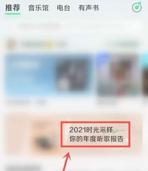 2、然后打开你的QQ音乐的APP,在首页中间的位置就可以很明显的看到有一个2021时光采样,你的年度听歌报告的字样,点击进入。