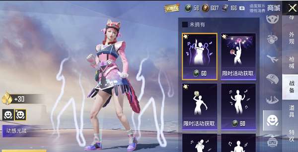1、动感光波是新上线的动作,价格60物资币,自带bgm。购买方式:商城-战备-动感光波动作,可以买168的箱子运气好开一个就搞定了