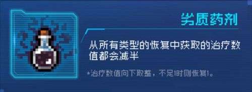 1、劣质药剂因子会将玩家所有类型的恢复数值减半。