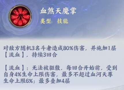 血河天尊其实更适合作为一个持续输出类型的角色用在队伍里面,她可以造成的持续流血效果在多种场合当中都是可以用起来的,而且如果是有其他成员搭配的情况下还可以造成多重反击的能力,初始的普攻只是一个对于单体对手可以带来输出的能力,但是血煞天魔掌就可以让血河天尊有一定的群攻能力,在她使用这个技能的时候,可以对敌方随机的3名斗者造成80%伤害,然后还可以施加1层流血效果,后续再3个回合当中这个流血的状态都会持续无法被驱散,且在每一个回合开始前,对手都会受到自身4%生命上限伤害,当中的限制就是最多不超过血河天尊生命上限6%,但是这里的流血层数是最多可以叠加到4层的,所以放在这里也是一个好用的群攻能力。