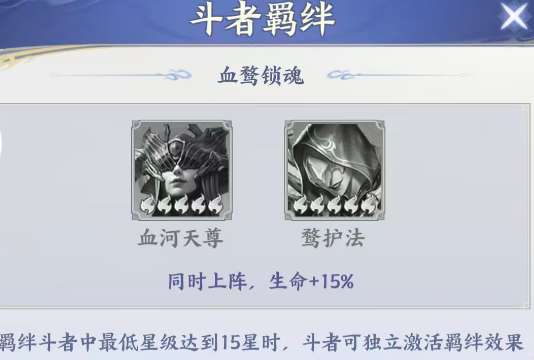 这个能力可以让羁绊成员获取生命+15%的提升,如果大家没有拿到这里羁绊角色也不用着急,因为后期在羁绊斗者最低星级达到15星的时候,这里只要是有羁绊效果的斗者都是可以独立激活羁绊效果的,但是前期大家还是比较需要羁绊成员的加成,特别是一个队伍当中不仅是可以只触发一个羁绊的情况下,血河天尊没有达到15星还是需要鹜护法加成的。