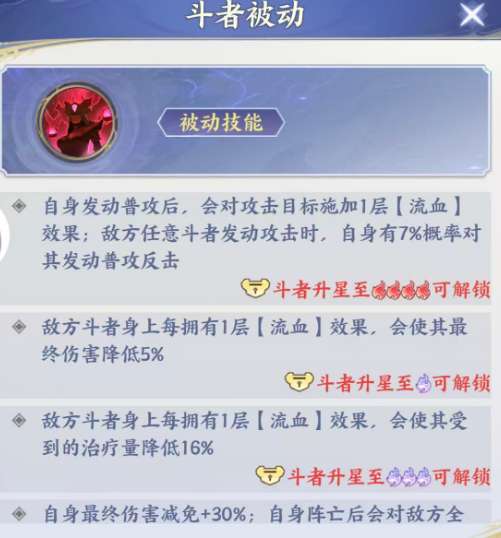 相比她的主动技能,其实血河天尊在被动上面的能力大家也不能忽视,这里她可以依靠自己的被动能力在发动普攻后就直接触发,触发成功的情况下会对攻击目标施加1层流血效果,如果此时还有敌方任意的斗者要发动攻击的话,血河天尊在场是会有7%概率对其发动普攻反击的,而且技能升星之后敌方斗者身上只要是每拥有1层流血效果的情况下,这个反击的能力都会使敌人对我方最终的伤害降低5%,然后还可以根据敌人身上每拥有1层流血的效果,来使敌人受到的治疗量降低16%,所以对于对面奶妈来说会更有压力一些,被动当中升级到最高的时候,其中能够达到的最后一个能力就是让血河天尊自身最终伤害数值上面会减免30%的数值,而且在她阵亡后,也会对敌方全体单位造成100%伤害,只要是她阵亡之前有累计发动普攻的话,一次普攻就会将她阵亡触发的技能伤害提升15%,最大的时候这个数值是可以提升到90%的。