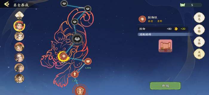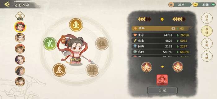 很经典的升级,名士升级优先拉满最重要的5个,在没解锁序学前,可以多选几个名士升到50级提高物资产量。