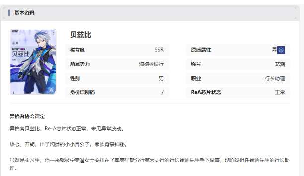 伊瑟贝兹比怎么样?在这一个游戏的世界中,大家就可以看到比较招人喜欢的年轻角色。伊瑟贝兹比这可是明星助理,那到底又有什么样的特点呢?其实这就是一个很热心肠的贵公子家族背景很神秘,但是出手就是阔绰。别看是一个实习生,没有想到起点还是很高的,那么还有什么样的特点呢?