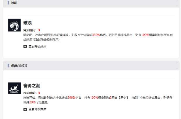 破浪这就是三回合冷却技能,属于一个群体攻击技能。召唤海浪就可以打出330%的伤害,关键是只要暴击,就能百分百把目标身上的减益效果全部延长一个回合。配合队友叠加伤害就可以形成持续的压制。奋勇之潮是一个终结技能,同样是三个回合,冷却又被称之为爆发王牌。全体会造成390%的高额伤害,而且还会有100%的几率可以直接挂易伤,让队友在后续的环节中会拥有更出色的输出。更厉害的是每一次暴击一个单位,自己就可以迅速的提升20%的行动速度。暴击如果满员的话,那就可以直接进入到半轮,简直就是越战越勇。