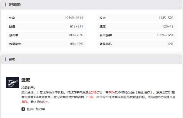 先来看一下属性面板实力真的是一点都不含糊。基础生命值会达到10,649,并且还会额外的增加3315,续航的底子还是很扎实的。攻击力是1135,加上509的加成,输出的能力很不错。防御力是612,并且还会有211的增幅,并不算特别的脆。速度是120,加上15出手的节奏也是比较舒服的。暴击属性也会很亮眼,基础暴击率10%+20%的加成暴击伤害是150%加上12%。在打控制还有爆发时都会很有保障。