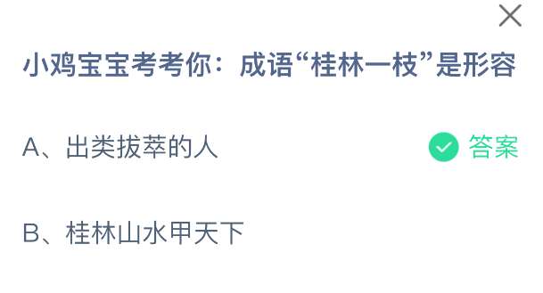 以上就是小鸡宝宝考考你:成语“桂林一枝”是形容,支付宝蚂蚁庄园2025年10月18日答案最新,更多精彩内容,请点击关注pk游戏网更新!