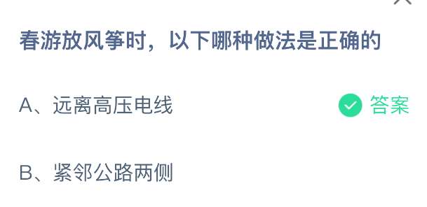春游放风筝时,以下哪种做法是正确的?支付宝小鸡课堂新的一天答题开始啦!每天只需花一分钟,动动手指答对问题,180g饲料立马到账!2026年4月21日蚂蚁庄园的小鸡课堂题目正确答案是【远离高压电线】,放风筝必须远离高压电线,因为风筝线一旦触碰高压线,极易导致触电伤亡或线路故障。公路两侧车流密集,也不安全。应选择空旷、无电力设施的场地。