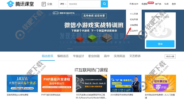 1、首先打开腾讯课堂的官网首页,打开之后点击首页界面右上角的【开课/合作】选项,点击之后会弹出相应的功能选项,在功能选项中点击【分销课程】进入分销课程界面;