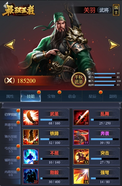 英雄技能推荐:武圣,无双,乱舞,金刚。