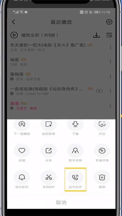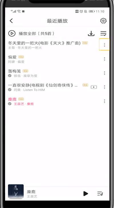 2、找到你想要设置成来电铃声的歌曲,点击歌曲旁的菜单栏