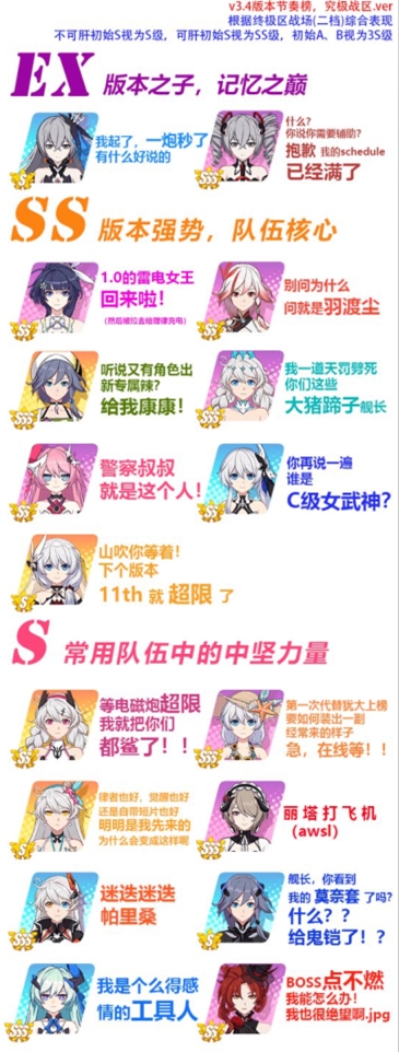 先解释一下这个榜单的评价标准:不可肝初始S视为S级,可肝初始S视为SS级,初始A、B视为3S级。装备以毕业装为基准。在这一前提下考量角色在记忆战场二档为目标的情况下的表现。低阶或低配也有优秀表现可以视为加分项,在深渊或其它玩法中有突出表现视为加分项,但是不作为核心考量标准。同一阶 级内从上到下排行。(B级排行不分先后)