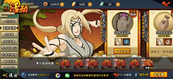 活动内容:活动期间,挑战百豪纲手,完成成就任务,即可获得祝福券、声望、忍玉等成就奖励。挑战达到指定次数,还可获得额外奖励。学员每日可免费获得2次挑战机会,花费金币可额外购买2次挑战机会。挑战胜利或失败均会计算关卡得分与挑战次数。每位学员最高3场单局得分之和将会记入排行榜排名。首次分享活动可获得20金币奖励。