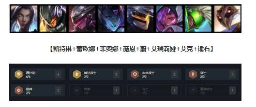 羁绊简析 :给到薇恩剑士转职,使薇恩同时享受源计划、狙神、剑士、未来战士四羁绊加成,攻击力、生命值、攻速、伤害都大幅提升。围绕薇恩建立一套核心物理输出体系,再强化艾克提升法术输出。 核心英雄
