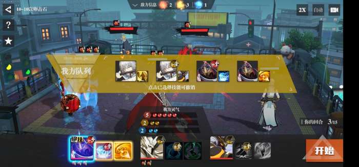 第二回合,轮到许褚上场了,但是在许褚上场之前最好把紫曹的二技能打出去叠加灼烧,然后徐晃先使用二技能给自己回口血或者刘羽禅二技能回血,最后把徐晃的气定神闲放在第四行动位,一次获得三个黄色灵气。