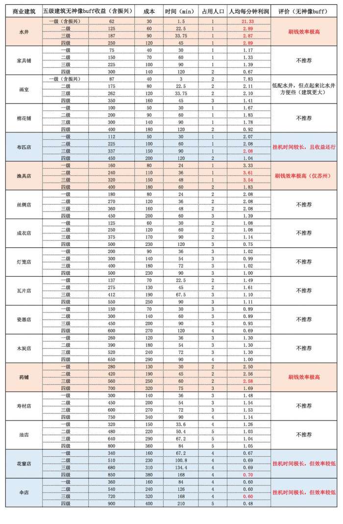 不含神像buff的情况下,所有满级铜钱建筑分析: