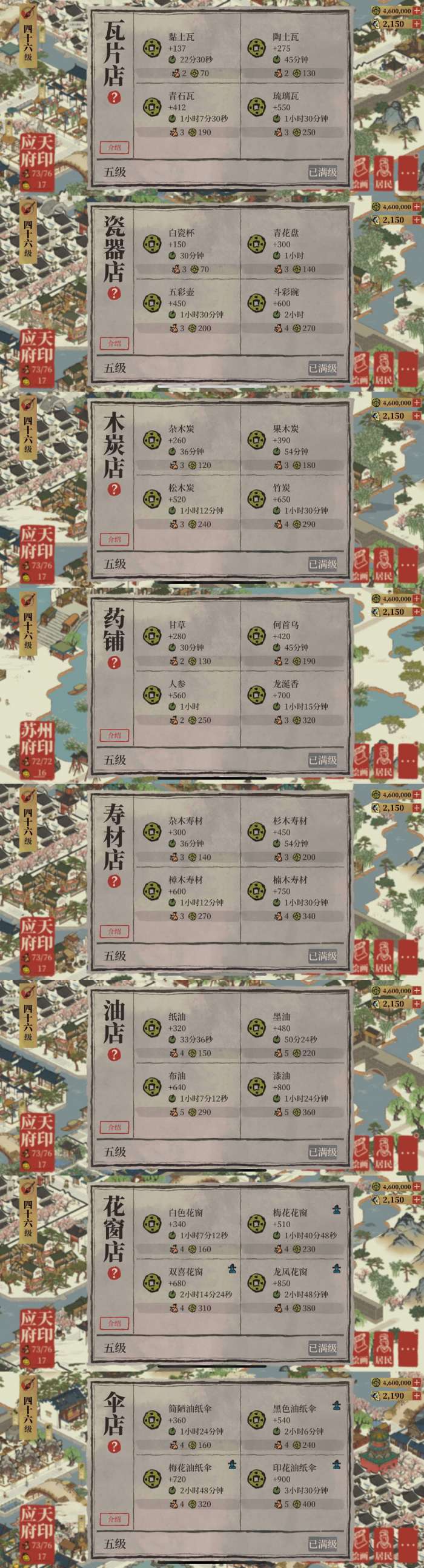 5. 游戏后期,挂机时间较长(适合离线时间普遍高于3小时的):花窗店、伞店