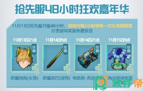 11月13日—11月15日8点(限号不删档期间),还将开启48小时狂欢嘉年华福利回馈,提前进入游戏的玩家,可享受48小时原住民狂欢节的重磅福利!游戏内每2小时将有一次礼包雨砸落,各类珍贵游戏奖励都将免费进行放送,其中包括各类稀有饰品、建筑大礼包、时装、道具等等,机不可失时不再来!