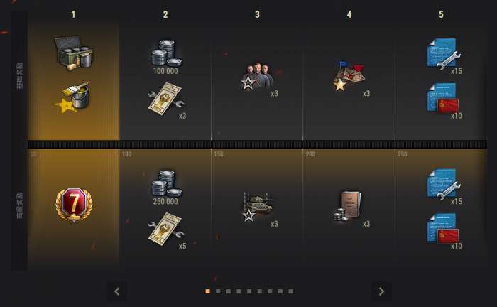 每完成一个阶段,就能获得对应的战斗通行证奖励。奖励有:个性化元素、银币、高级账号、个人储备、蓝图、乘员手册、标准和赏金配件、拆卸工具等等。活动的最终奖励是一位特殊的乘员以及最多获得两款3D风格。活动的额外奖励是战争债券。