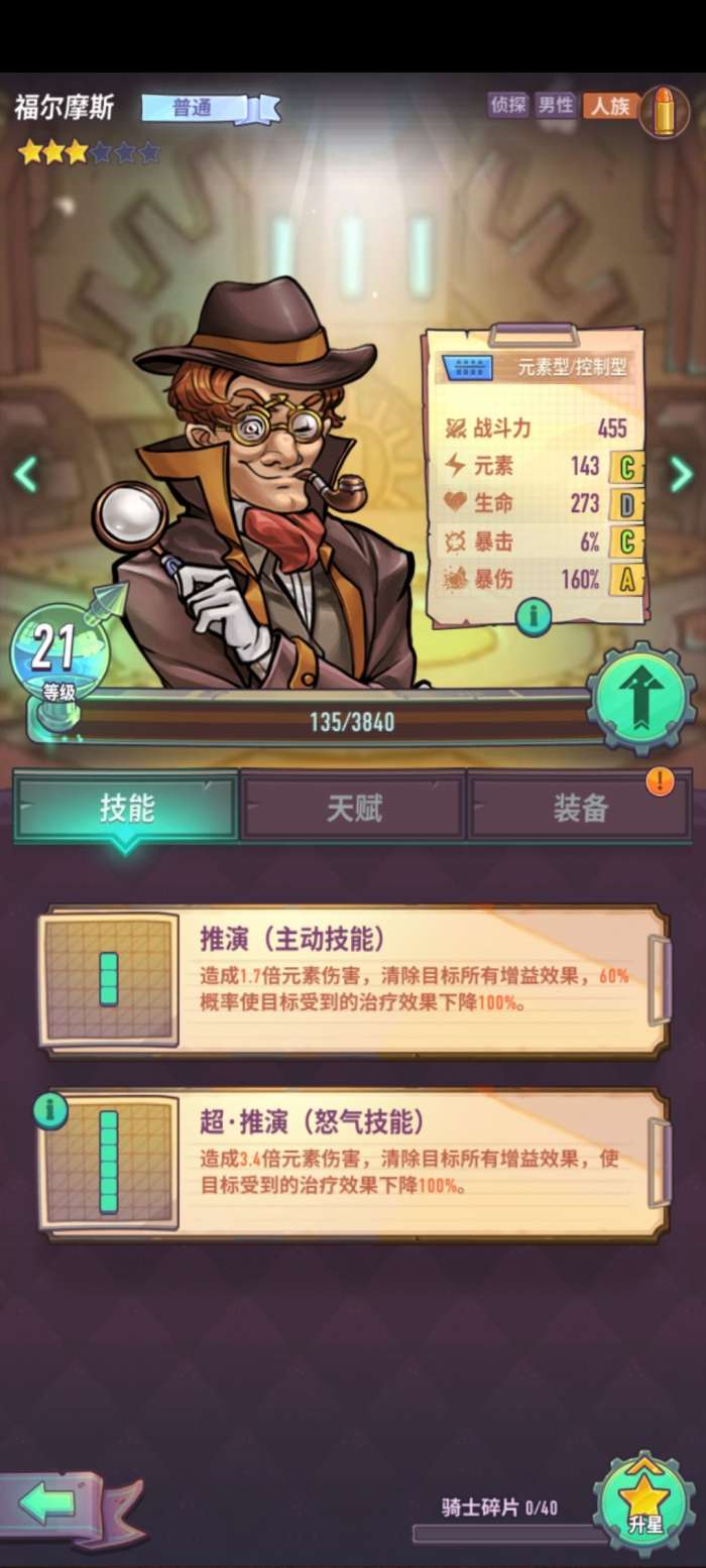 ⑤福尔摩斯,工具人之一,技能2回合禁疗(画重点),必练角色,等级不用升,因为是普通角色星级够了,概率上去就可以,也是凭福尔摩斯,我爬塔才能上100层(战力太极限了,一点伤害都没多出来5回合所有人打完过的boss)⑥普通的角色天赋里都有附带资源产出,以后肯定是都要点的。然后就是贞德和亚历山大亚瑟这3个个人是觉得上位角色比较多加上因为有了花木兰的盾和路易十四的回血,目前我自己感觉他们的比重是降了很多(主要是经验太难了,把3个普通升太高感觉有点划不来),红角色德雷克和伊丽莎白因为入手确实简单而且用起来很舒服,慢慢也是要替代的