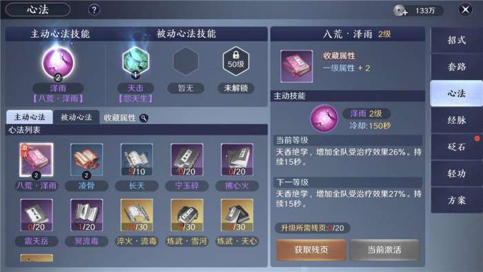 1、可通过消耗心法残页获得心法,可以在心法槽装备一本主动心法和三本被动心法。