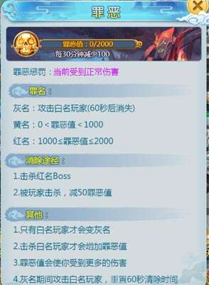 罪恶值这个系统是有点类似于传奇型网游中的红名一说,当你攻击不同的玩家时就会获得相应的罪恶值,根据罪恶值将你的名字改成相应的颜色。然后不同的颜色有不同的处罚。下面就来仔细看一看吧。