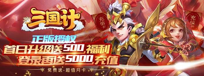 《三国计》正版授权三国回合制手游,携5500元充值壕礼福利来袭!登录免费送月卡可激活充值活动,首日升级送500元充值,登录再送5000充值,免费升级满级VIP,打造前所未有的战斗回合体验!人气大作轻松上手,战马飞驰、三国名将,巾帼英雄豪情助战!更有上古灵兽强力助阵,突破极限激发最强战力,让你体验全新刺激的三国之旅!