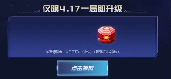 仅限4.17 一局即升级!小伙伴们在活动当天4.17日参与游戏一局无尽挑战-末日工厂后即可直接领取神圣爆裂者—末日工厂II(永久)+顶级符文宝箱×1道具奖励哦~