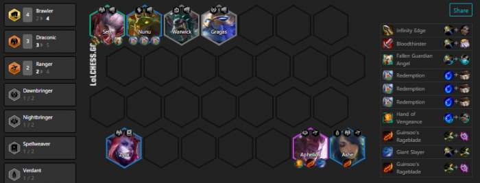 开局斗士龙族全抓,3-2升6,搜出四斗三龙立即停手攒经济,攻速多走线,法伤多走双法线,龙族牌除瑟提和自己养的那条线的C以外,其他牌均卖掉补经济,4-1跟大部队拉7,逆风上8补熊菊靠血量苟烂分;顺风上8挂4斗5龙,直线拉9,等质量足够,把5龙降级成3龙拼4、5费优质紫橙