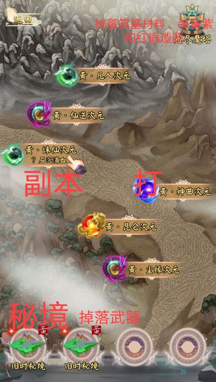 第十一,平时刷秘境的时候第一个技能放群体,后面单体,冲塔全单体,刚入金丹的时候可能差点攻击力打最高秘境,就选择次一级,然后在你获得蓝色地级武器的时候可以先用着,再慢慢提升,然后掉落的秘境分为4种,姑且可以称为天地玄黄,天级8小时开启,能出红色武器,地级3小时,不知道能出红色否,玄级1小时,黄级6分钟。