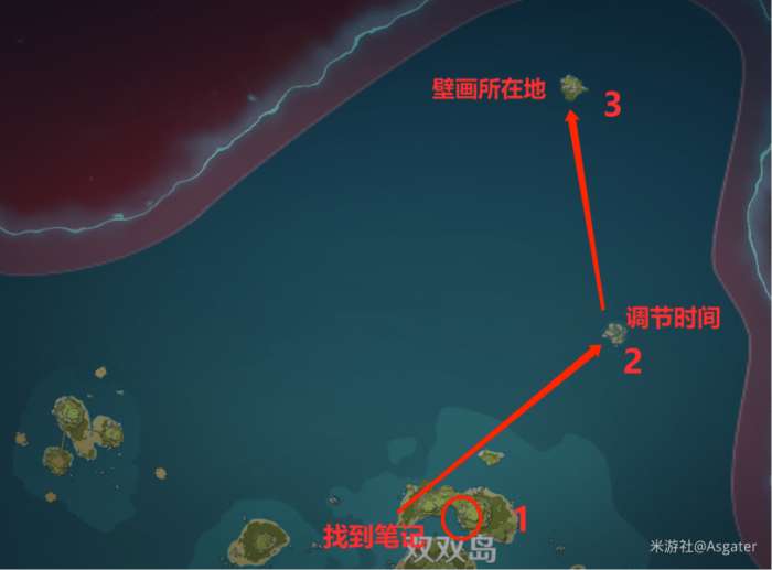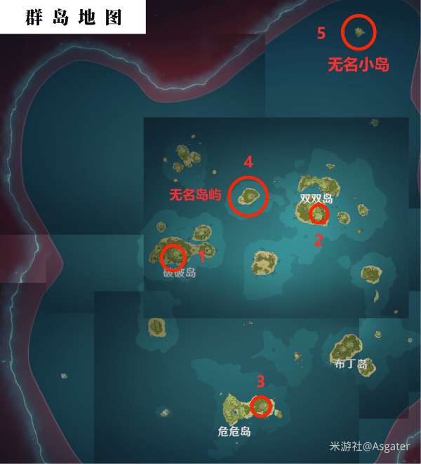 这一解密探索任务所要收集的壁画分别是:破破岛、双双岛、危危岛、无名岛屿、无名小岛,共计5处壁画,下图为5处壁画所在的全部显示点位: