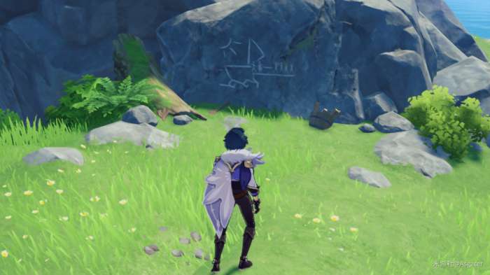 根据图中标识抵达该处岛屿,在该处高山山下的石壁上即可找到第4处壁画;