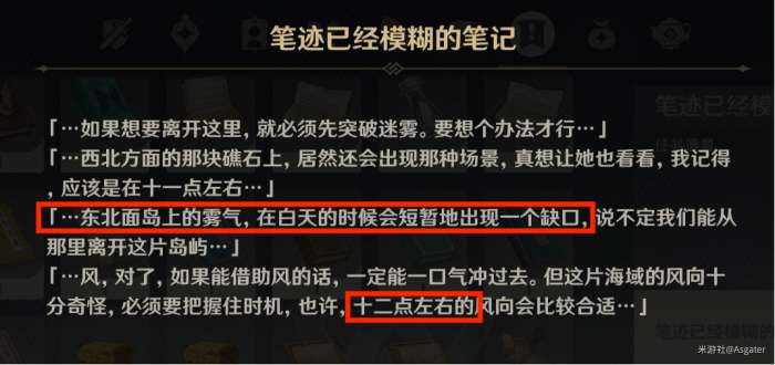 2、根据笔记内容在到达标记2处的小岛之后将时间调整至中午12点既可以通过风向的指示(海面上存在的白色条纹)抵达东北处的无名小岛。