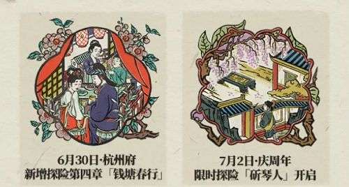 1、6月30日杭州府新增探险第四章钱塘春行,同时在7月2日庆周年限时探险斫琴人开启,届时会有好玩的玩法等待着大家。