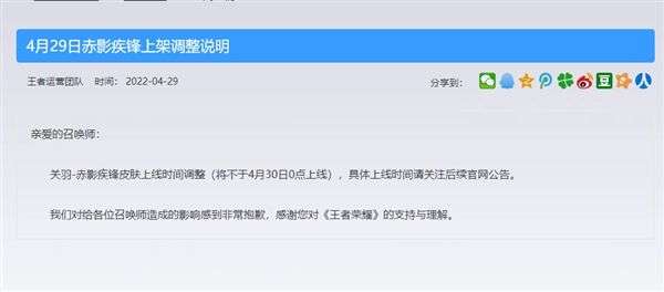 关羽-赤影疾锋皮肤上线时间调整(将不于4月30日0点上线),具体上线时间请关注后续官网公告。