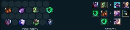 守护神的站位都放置在前排,后排给到游侠线的英雄,这个阵容的基础站位也是可以按四角站位的模式排开,而锤石可以考虑替换成水晶拉克丝,直接增加四水晶的超硬的体系。