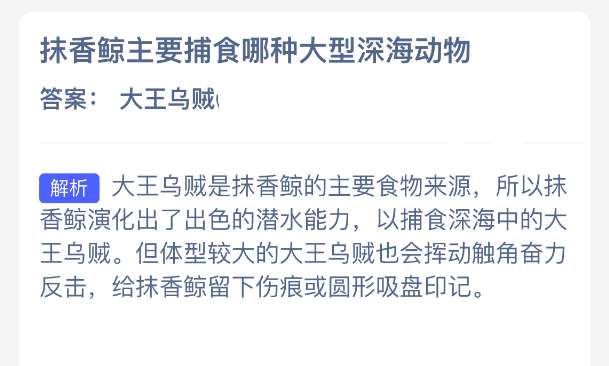 抹香鲸主要捕食哪种大型深海动物?【神奇海洋】12月8日新题目已开答!正确答案现已公布,点击领取拼图,一起为修复海洋生态贡献力量!今日正确答案是:【大王乌贼】。大王乌贼是抹香鲸的主要食物来源,所以抹香鲸演化出了出色的潜水能力,以捕食深海中的大王乌贼。