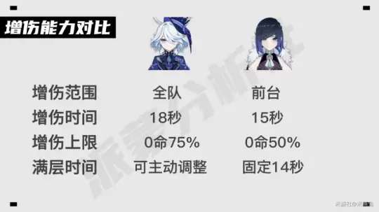增伤方面:开启大招后前台角色伤害提高1%,随后每秒提升3.5%,到第14秒吃满50%增伤,到第15秒增伤效果消失。