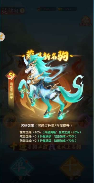 在游戏中玩家们可以通过各种途径来获得战马,比如通关奖励,签到奖励、活动福利等。当然最直接高效的方法就是在灵骕涧中去进行战马的抽取。抽取战马所需要的寻驹令则可以在游戏的诸多玩法中获得。游戏里的战马目前主要分为三种类型:进攻类,防御类和辅助类,不同定位的战马所自带的技能效果和正常作用也截然不同。每匹战马在获得时都会附带一条随机的属性词条,如伤害率、免伤率、格挡率、治疗率等,词条的类型与品质会直接影响战马的实际效果,如果其与战马的定位和武将的技能不匹配,就很难发挥出最大战力。因此洗练是战马养成十分关键的一步。