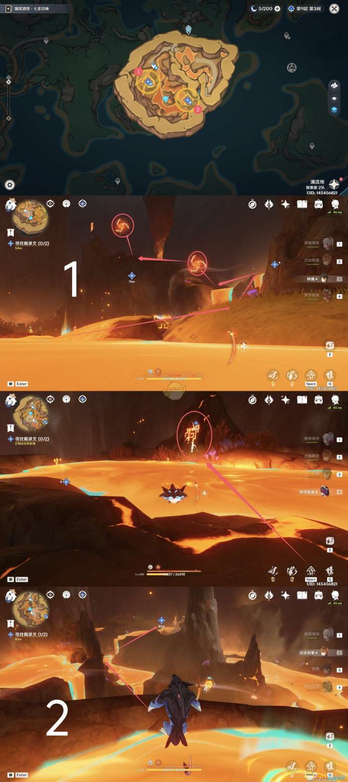 第一处揭录文:首先我们需要先关闭两个镌光集束,前往途中有跳跃圈可便捷到达,靠近即可关闭镌光集束,两处都关闭之后再通过鳍游龙普通攻击收集揭录文。