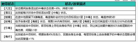 毒伤类一共有6种附带状态:亢龙+落花+蛤蟆+射毒+引毒+毒疗,其中附带【蛤蟆】武学是核心技能,伤害最高。